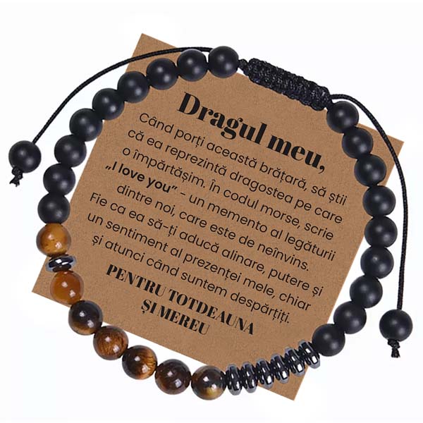 Când porți această brățară, să știi că ea reprezintă dragostea pe care o împărtăşim. În codul morse, scrie ,,I love you” – un memento al legăturii dintre noi, care este de neînvins. Fie ca ea să-ţi aducă alinare, putere și un sentiment al prezenței mele, chiar şi atunci când suntem despărțiți.