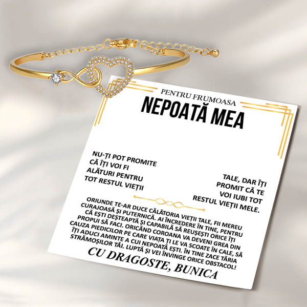 Brățara combină un simbol al infinitului cu un motiv de inimă, reprezentând dragostea veșnică și legătura inseparabilă.