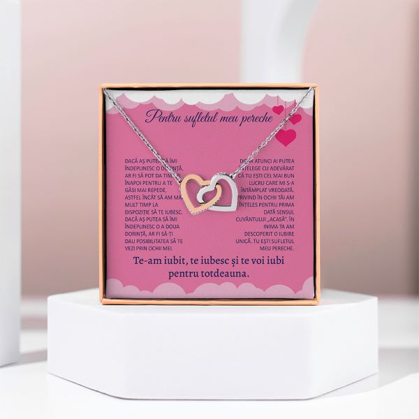 Colierul reprezintă un simbol frumos al iubirii care combină designul elegant și valoarea emoțională profundă. Având un motiv de două inimi împletite, acest colier reprezintă împreună și dragoste veșnică, făcându-l cadoul perfect pentru o persoană iubită.